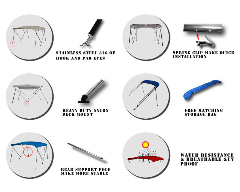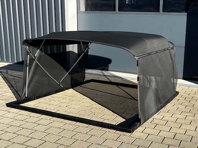 Das Gestänge des Bimini Top ist aus Aluminium hergestellt . Das Verdeckstuch ist aus Polyestergewebe hergestellt und sehr strapazierfähig.